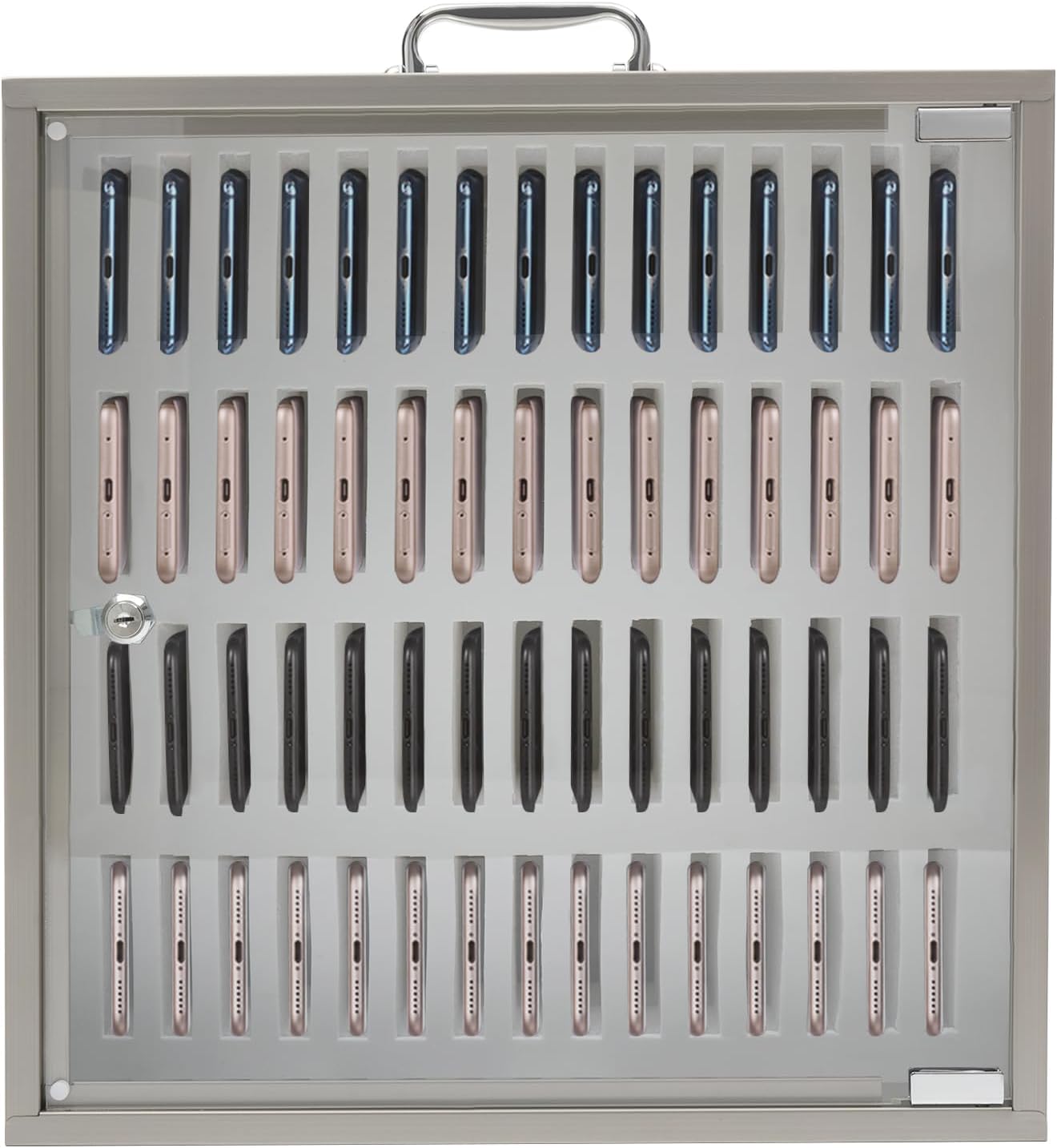 Introducing our versatile Cell Phone Storage Cabinet, designed to meet the needs of both personal and professional environments. Constructed from durable aluminum alloy and MDF, this cabinet is not only stylish with its sleek silver finish but also practical, featuring a lockable design to keep your devices safe and secure. Ideal for offices, schools, or homes, our cabinet provides a convenient solution to declutter your space while ensuring that your devices are organized and accessible. With a generous capacity of 36 slots, each compartment measuring 1.8*9*16cm, you can easily store smartphones, tablets, and other small electronic devices. This is particularly beneficial in environments where device management is crucial, such as during meetings or classes, allowing everyone to focus without distractions. The cabinet's wall mount and freestanding options provide flexibility in placement, making it easy to integrate into any room layout. The Plexiglas cabinet door offers visibility while protecting your devices from dust and damage, ensuring they remain in pristine condition. Included in your purchase are two keys for added security and all necessary installation accessories, making setup a breeze. Please note that slight color variations may occur due to lighting, and we recommend measuring your space to confirm fit. Enhance your organization and device security with our Cell Phone Storage Cabinet—a practical addition to any space that values efficiency and style. Experience the convenience of organized storage today!