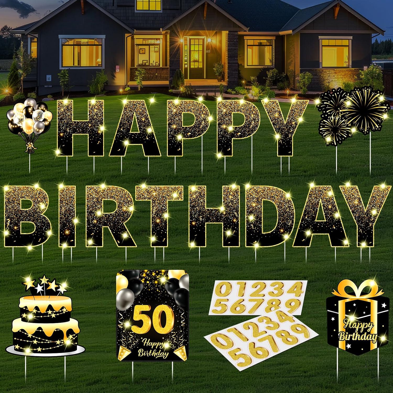 Features: Create an impact with our letter yard sign. Ideal as party decoration, spell out your wishes and greetings right on your lawn. Proclaim your joy through these yard birthday signs. You'll definitely stand out with our front yard decorations. Our birthday lawn decorations are suitable for many outdoor spaces. Be it your garden, porch, or even public celebration, our outdoor birthday decorations bring the joy wherever they're placed. With wide applications, they can partake in different kinds of party themes and settings. Specifications: Material: mainly corrugated cardboard and plastic stakes Color: mainly black and gold Size: Yard signs: about 13.78 x 11.8 inches/ 35 x 30 cm LED light strings: about 16.4 ft/ 5 m Package includes: 18 x Yard birthday signs 2 x LED light strings 2 Sheets 0-9 number stickers Notes: Manual measurement, please allow slight errors on size. The color may exist a slight difference due to different screen displays. The battery life is related to the frequency and length of use of the product. If the frequency of use is high, and one time use long, the battery life will be relatively short. Warm reminder: "For safety and longer life, always fully unfold the bulbs before use. Bundling them can cause overheating and hazards."