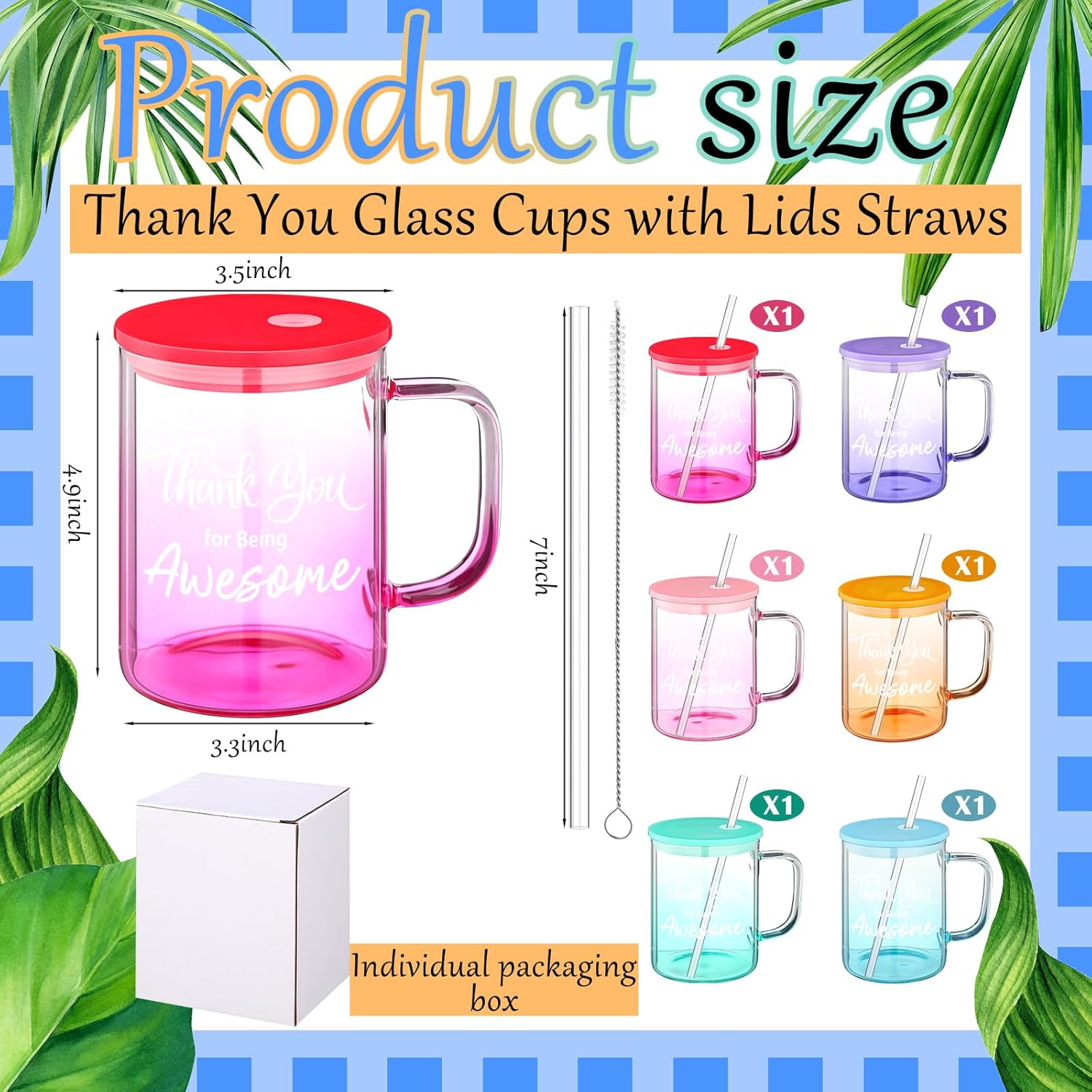Features: Cheerful and charming, the thank you cups make a lovely addition to your kitchen. Whether you are enjoying a warm cup of tea at home or at a picnic, these cups will always remind you of the joy of showing appreciation and the beauty of gratitude. Not just your average glass cup, these beautiful glass cups with lid and straw come equipped with lids and straws, making them ideal for refreshing summer beverages or even as an elegant cocktail glass for parties. They're an all around thank you cup, versatile enough to use for any occasion. Specifications: Material: glass Color: gradient color Size: 4.9 x 3.5 x 3.2 inches Package includes: 6 x Glass cup with lid and straw 6 x Eyedropper brush Notes: Manual measurement, please allow slight errors on size. The color may exist a slight difference due to different screen displays.