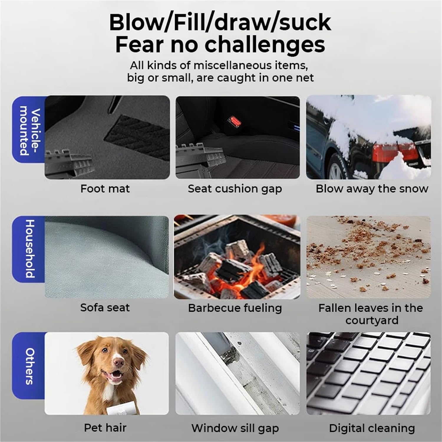 Snow BlowersFeatures:1.1000000 RPM turbofan, brushless motor, powerful.2. Strong dust removal, handling a series of debris such as accumulated dust, sand, hair, etc.3. Built in 21700 lithium battery, with long battery life and up to 2 hours of low-frequency use.4.Wide Usage:Air cushion blowing and suction, computer equipment cleaning, industrial dust blowing, charcoal burning to support combustion, car blowing and snow blowing, film studio shooting and wind making, drying pets, and many other uses.Specification:Battery capacity: 10000mAh (5000mAh*2)Built in two 21700 batteriesWind speed: 58m/sWorking voltage: 7.4VCharging time: 3-4 hoursWind speed gear: infinite speed regulationElectric tuning: 30mAhPackage Included :1pcs * Fan.==========High-concerned chemical : NoneBattery Included : YesModel Number : 6 Speeds Adjustable Jet FanUse : Home DIYPressure : Medium PressureMotor : Brushless
