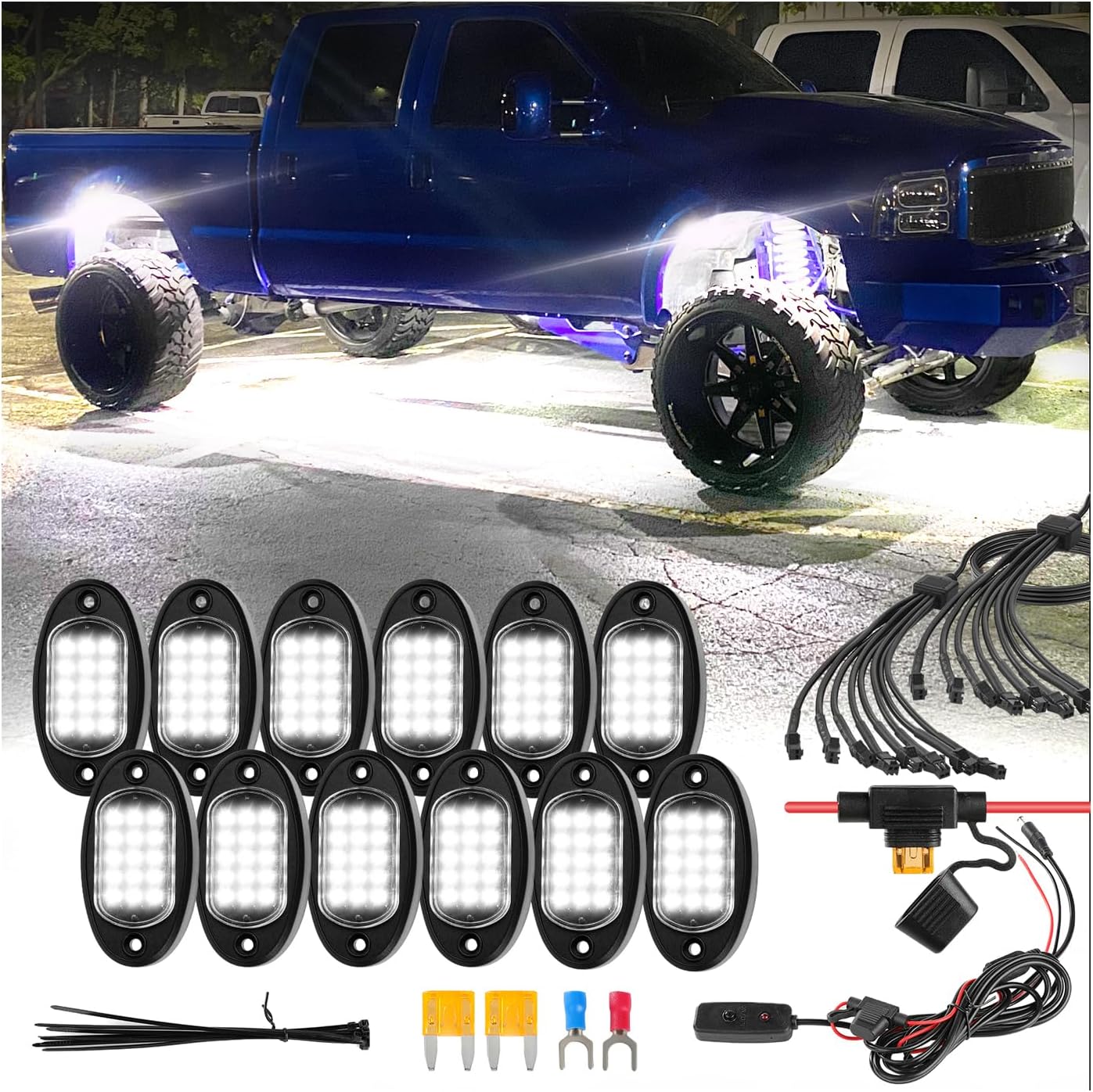 | Included Components | 4×76-inch extension cord, 8Pods Pure White LED Rock Lights(includes the splitter), Self-tapping Screw, cable ties, power switch, wire connectors, spare fuses |