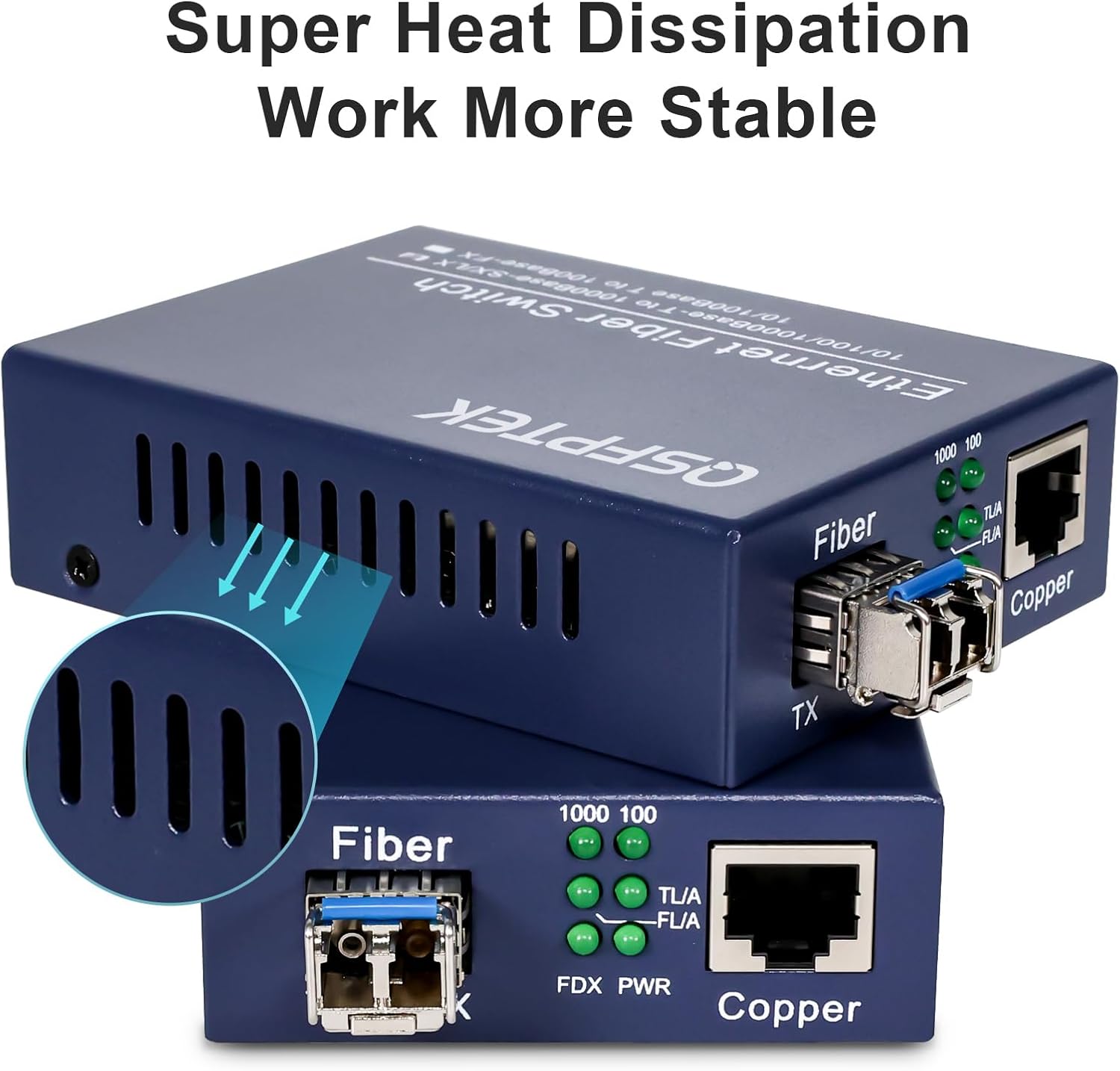 1 Pair Gigabit Ethernet Network Media Converter (10/100/1000Base-T RJ45 to 1000Base-SX SFP module) The Gigabit Ethernet media converter enhances communication distance and efficiently transmits data through fiber optic cables. It is designed to meet the increasing demand for higher power requirements in network equipment like network cameras, VOIP telephones, wireless LAN access points, and other devices. By leveraging the RJ45 interface, this media converter enables the direct delivery of data and power to network devices without additional power outlets or electrical cabling. The QSFPTEK media converters offer compatibility with a wide range of transceiver modules, including general 1000Base SFP transceivers, BIDI transceivers, CWDM transceivers, and more. It is essential to ensure consistency in the wavelength, speed rate, and distance of the transceiver modules used at both ends of the media converter.