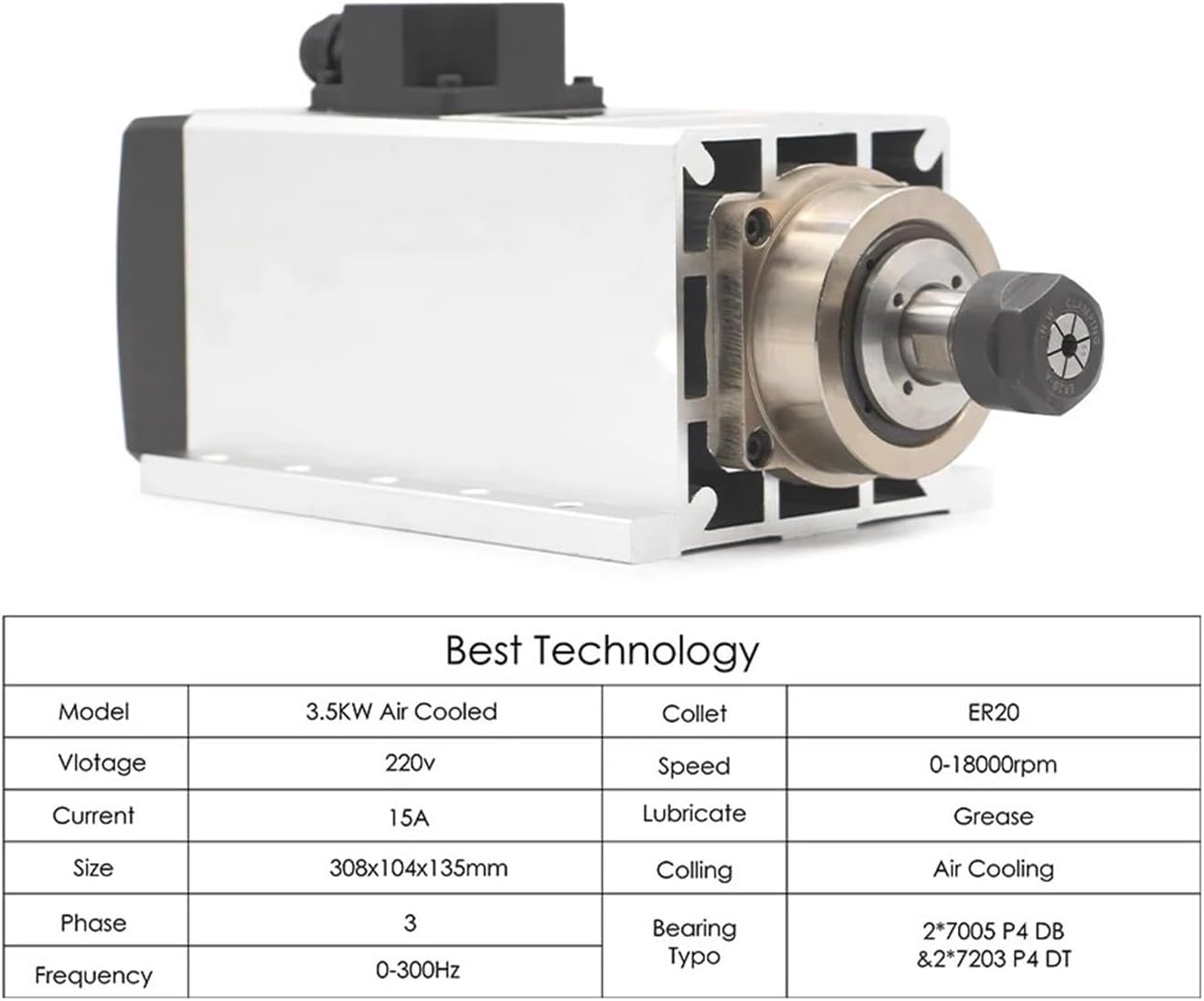 Slotting Cutter ArborsDimensions: 308x104x135mmSpeed regulation method: Through the three-phase output inverter, adjust the inverter frequency to change the spindle speedCooling method: air coolingPower: 3.5kw (1HP=0.735w)Voltage: 220V/380VCurrent: 15AFrequency: 0-300HzSpeed: 0-18000rpmRunout: less than 0.01mmBearing type: 2x7007C P4 DB (ceramic ball bearings) and 2x7203C P4 DTChuck ER20Clamping knife diameter 1mm2mm3mm3175mm(1/8),4mm,5mm,6mm,6.35mm(1/4),7mm,8mm,9mm,10mm,11mm,12mm,12.7mm(1/2),13mm,Inverter type: Huayang 220v 4.0kwInput voltage: 220V (+/-15%)Output voltage: 220vACInput frequency: 48-63 HzOutput frequency: 0-400HzInput phase: single phase or three phaseOutput phase: 3 phases