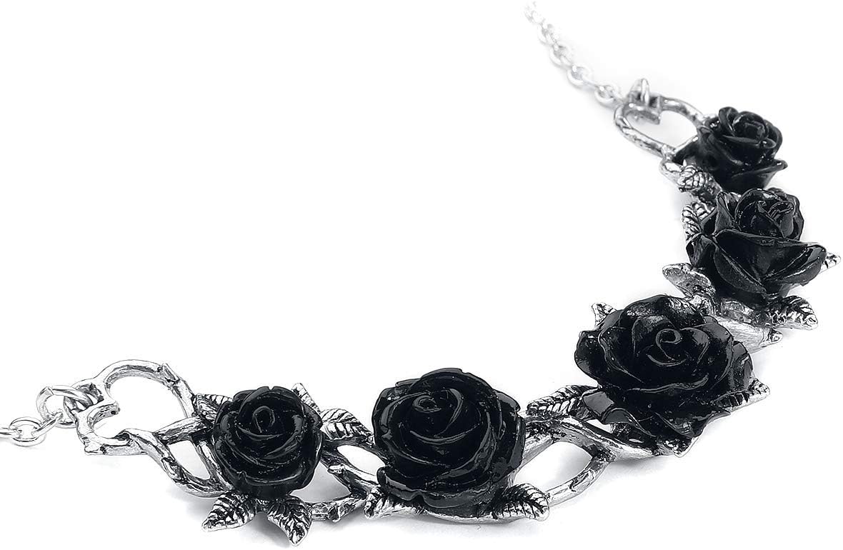 A grave but beautiful garland of arcane mystique; five sinister, sable blooms standing for the elements of nature, including the fundamental focal point of the spirit. Your little black dress is screaming out for this necklace! This single-piece cast Pewter crescent choker of rose stems and leaves is set with five resin, black rose flower heads on split trace chain, 17" (42cm) overall plus a 35mm extender chain, with lobster claw fastener.