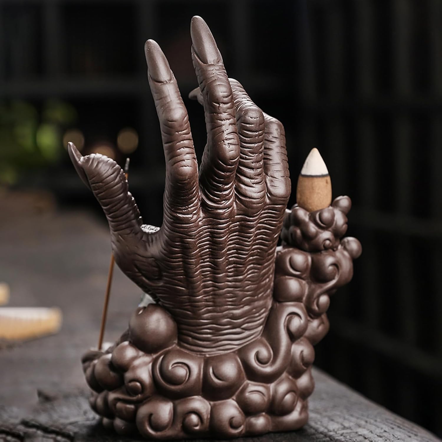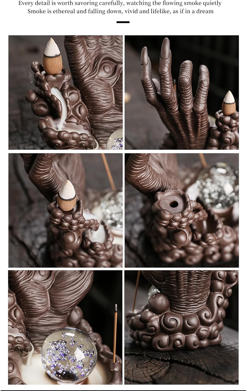 Product Description:Product Specifications:Censer size (in cm): 17Wx23Lx16H (6.7inchx9inchx6.3inch)Material: Purple sand, handmade.Incense species: Cone / backflow incensePackage included:1pcs Ceramic LED backflow incense holders50 x Backflow Cones30 x Incense Sticks1 x Mat1 x TweezerBackflow Incense Burner Features:This skull incense burner skull is fired by nature soil with unique design. The backflow incense holder is surrounded by smoke, a mysterious atmosphere. Get relaxed from the physical to the psychological, put aside the troubles of life, Enjoy the peace of this moment.Buddha Hand Series Incense burner Function & Widely Use:This incense waterfall burner can be widely used in living room, bedroom, study, office, meditation room, yoga room, hotel, etc. It's also a perfect birthday gift, anniversary gift, Christmas gift... to Halloween/Horror fans, to friends who love aroma therapy, to people who like to burn incense, to anyone that likes skulls or just creative things.Notes:Due to the lighting and monitors, there are slight difference between the picture and the real item.Promise:If the product has any quality problems, please feel free to contact us, we will help you solve the problem as quickly as possible.