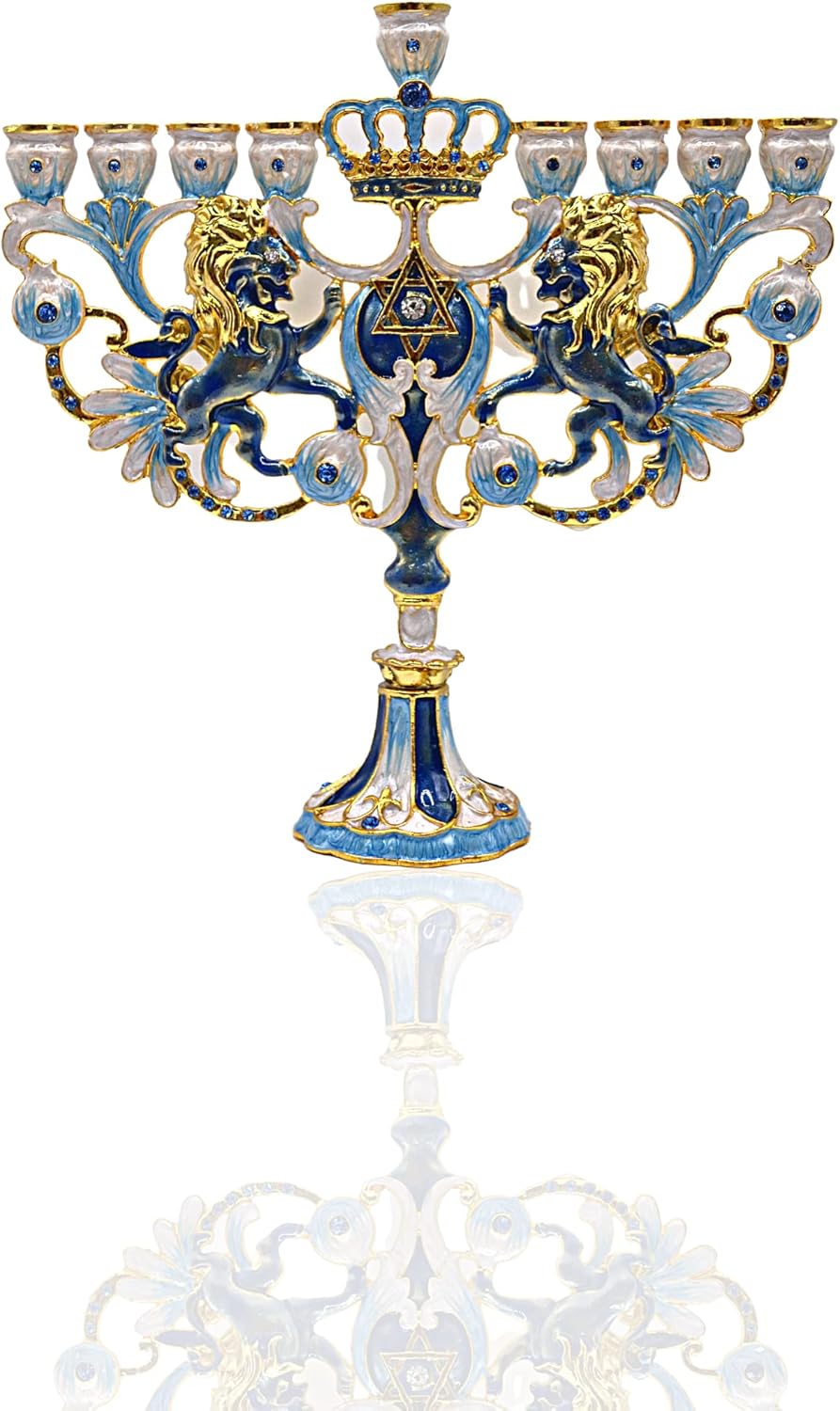 Cohen Tsemach Art&Gift Blue Enamel Hanukkah Menorah with Star Of David & Crystals *Hand painted with gorgeous light blue enamel and adorned with shiny crystals, Jewish Stars Of David, Jerusalem Lions and Royal Crown *Richly decorated with a floral motif *High quality artwork and elegant design *Size: 18 cm x 18 cm / 7" x 7" *Great gift directly from Israel *Comes in a gift box Israel Art Judaica Gift *Beautiful Hanukkah Menorah, candle holder for Hanukkah - Jewish Festival of Lights wedding gift A special gift for the home. This gift will upgrade any home and living room.