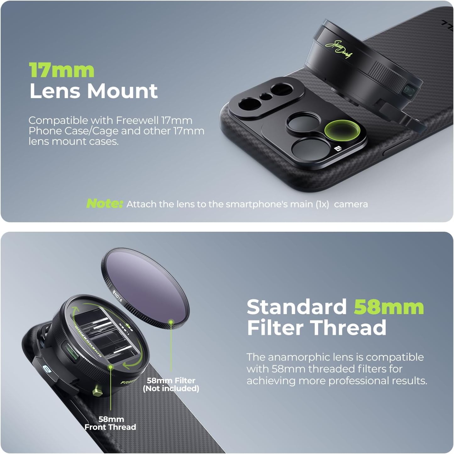 Freewell 1.33x Anamorphic Lens for iPhone & Samsung - 3 Flare Colors in One Lens (Neutral, Gold, Blue) - Cinematic Smartphone Lens with Oval Bokeh - Compatible with 17mm Mount Phone Case & Cage.