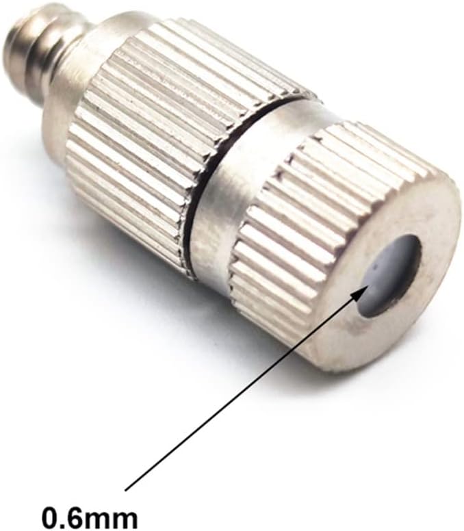 It is very suitable for agriculture, lawns, gardens, courtyards, greenhouses, flower beds, swimming pools, etc.1) The nozzle is made of high-quality brass, the main body is brass and nickel, and the inside is a ceramic head.2) The nozzle orifice can be selected from 0.1mm to 0.6mm3) A box of 50 pieces, well packed and safe4) The nozzle adopts high-efficiency atomization, which is a good choice for fog generation5) Connect with 10-24UNC threadspecificationOrifice: 0.1mm, 0.2mm, 0.3mm, 0.4mm, 0.5mm, 0.6mmMaterial: brass nickel-plated body + ceramic headWorking pressure: 600PSI--1000PSIThread size: 10-24UNC (3/16``) beautification.packing list:10 x atomizing nozzlesProduct DetailsInternal structureInternal anti-drip valvesizeNozzle size: 23mm long9mm wide3/16 external thread0.1mm-0.6mm orifice for your choiceapplication1. Cooling-outdoor restaurants, entertainment venues, stadiums, arenas, airports, bus stations, large gatherings, cooling animal farms pigs, horses, sheep2. Dust removal-remove dust particles in the air, mainly used to control pollution in farms and mines3. Agriculture-family farms, mushroom cultivation, circus, aviary and feedlots make the environment suitable for the growth of various poultry4. Industry-metal workshop, mechanical workshop, textile workshop, clothing workshop, dyeing shoes, injection molding, die-casting heat treatment, glass, spray coating, electronic chemical industry, metallurgy, leather, toy manufacturing, electronics manufacturing, cooling and dust removal5. Special-purpose spaces-gardens, zoos, shopping centers, exhibitions, flower breeding, animal husbandry, etc., humidified and cooled, and can also be used for plant irrigation