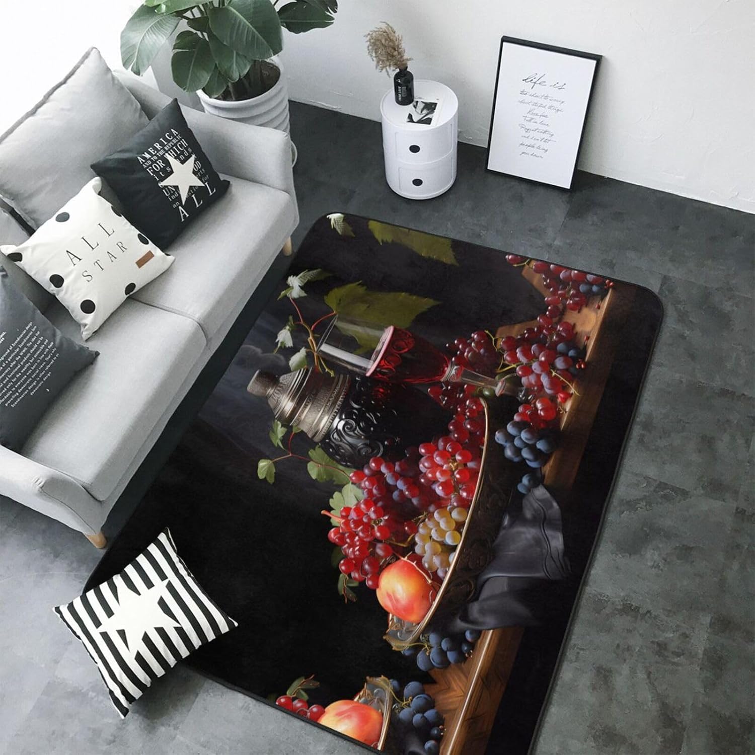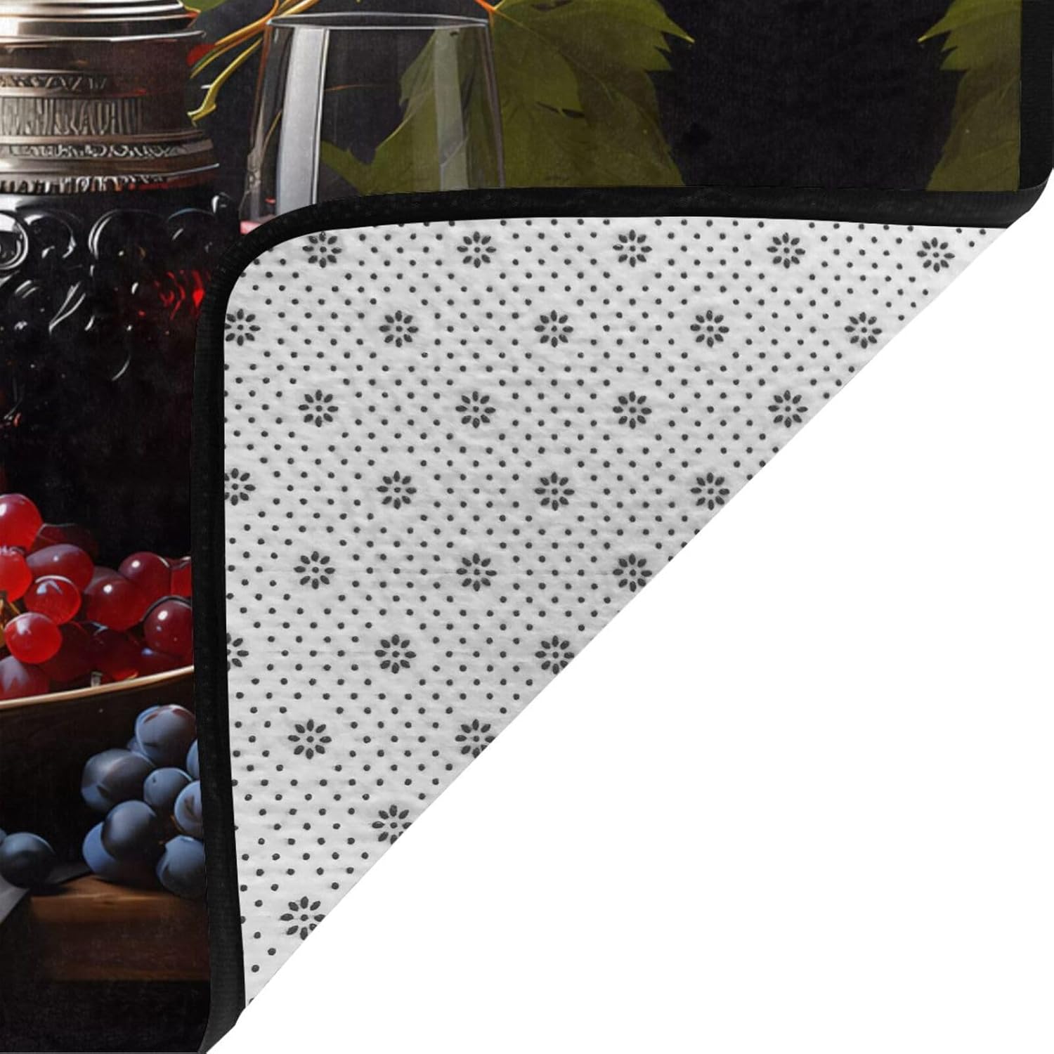 Choose our Grapes and Wine printed decorative carpet to bring meticulous care to your family. Made of high-specification polyester flannel, the pile is fine and dense, not easy to pilling and fading, and it will accompany you longer. The memory foam middle layer is like a caring friend, dynamically adjusting the foot pressure, relieving fatigue, and making your every step full of comfort. The non-slip bottom design is like a loyal guardian, silently protecting the safety of you and your family, especially suitable for families with elderly and children. Easy to clean, can be washed by water or machine, saving time and effort. Exquisite cutting and sewing technology ensures that the edge of the carpet is flat and burr-free, and the truth is in the details. Whether it is a bathroom, bedroom or office, it can add a touch of warmth and peace of mind to your life.