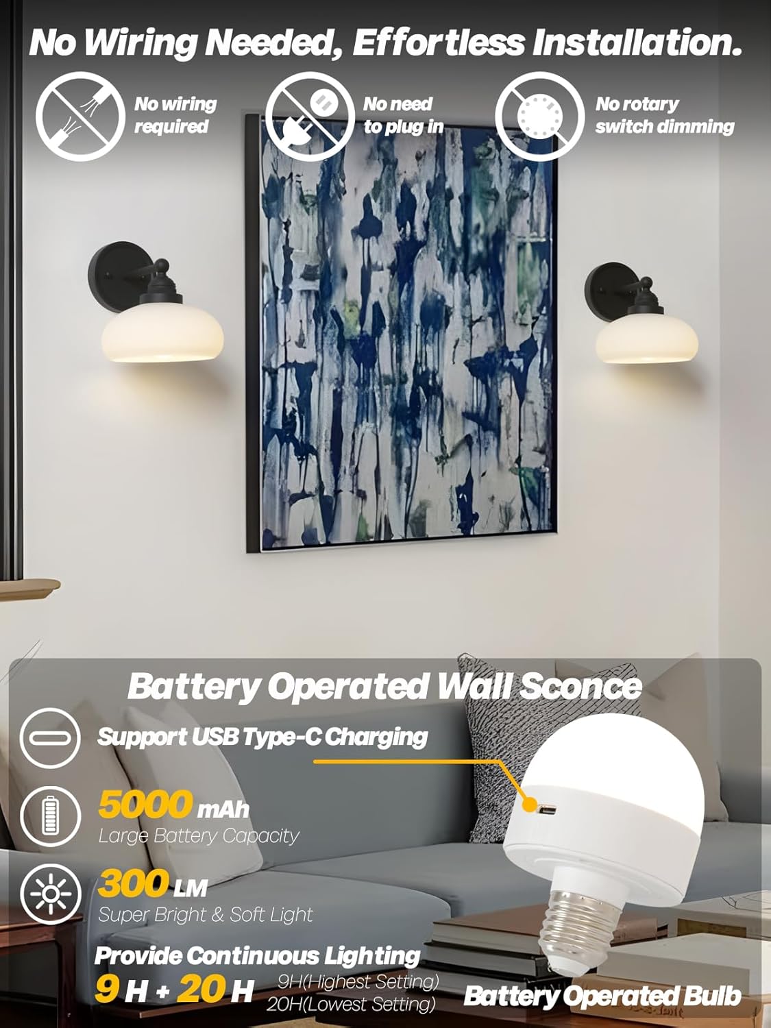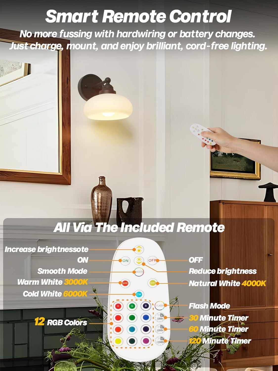 Features Bring vintage charm and smart convenience to your space with the HEQIQEH single-pack wall sconce. The unique flattened oval glass shade casts a diffused, milky glow while the straight metal arm (in matte black or antique brass) delivers sturdy style. Whether mounted bedside, in an entryway, or along a hallway, this sconce is designed for renters and decorators alike—no hardwiring or tools required.Enjoy the freedom of remote-controlled brightness, color, and power—all with optional timers that automatically turn the light off after 30, 60, or 120 minutes. Specializations Product Name: LED Battery Powered Wall Lamp Category: Indoor Wall Light Fixture Color: Black Material: Metal and Glass Dimmable or not: Yes Color Temperature Adjustable: Yes, 3 level Correlated Color Temperature (CCT): Cool White(6000K), Nature White(4000K), Warm white(3000K) Installation Orientation: No Wiring, Wall Mount Power wattage: 1W Light Source: Rechargeable LED Bulb (included) Power Source: USB Type-C Cable (Included) Package Included 1xRechargeable Battery Operated Wall Light 1xScrews Bag 1xUSB Type-C Cable 1xMulti-function Remote Control 1xUser Manual