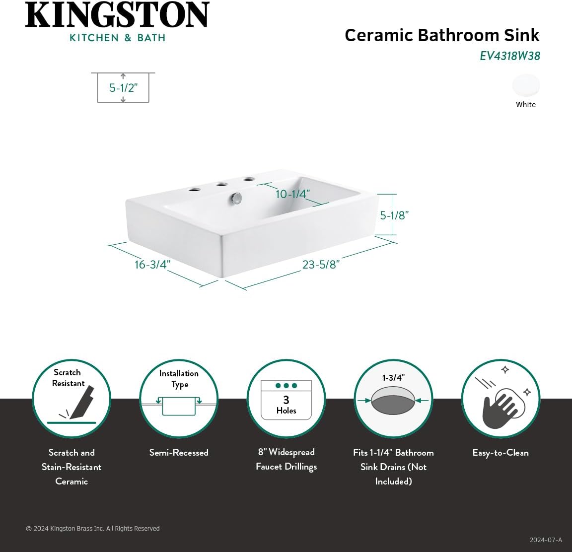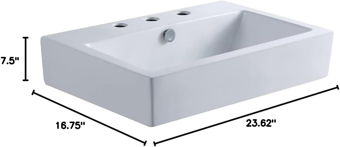 Built from a stunning ceramic for long-lasting durability, the ceramic bathroom sink offers elegant and transitional stylings. The pristine, stain-resistant surface and glistening finish make for a very sturdy fixture that is easily maintained. This bathroom sink in particular features dimensions of (L)23-5/8" x (W)16-3/4" x (H)7-1/2" with pre-drilled 3-hole for 8-inch widespread faucet installation. The semi-recessed installation allows the sink to partially sit below the counter for functionality and creates an elegant appearance in your bathroom.