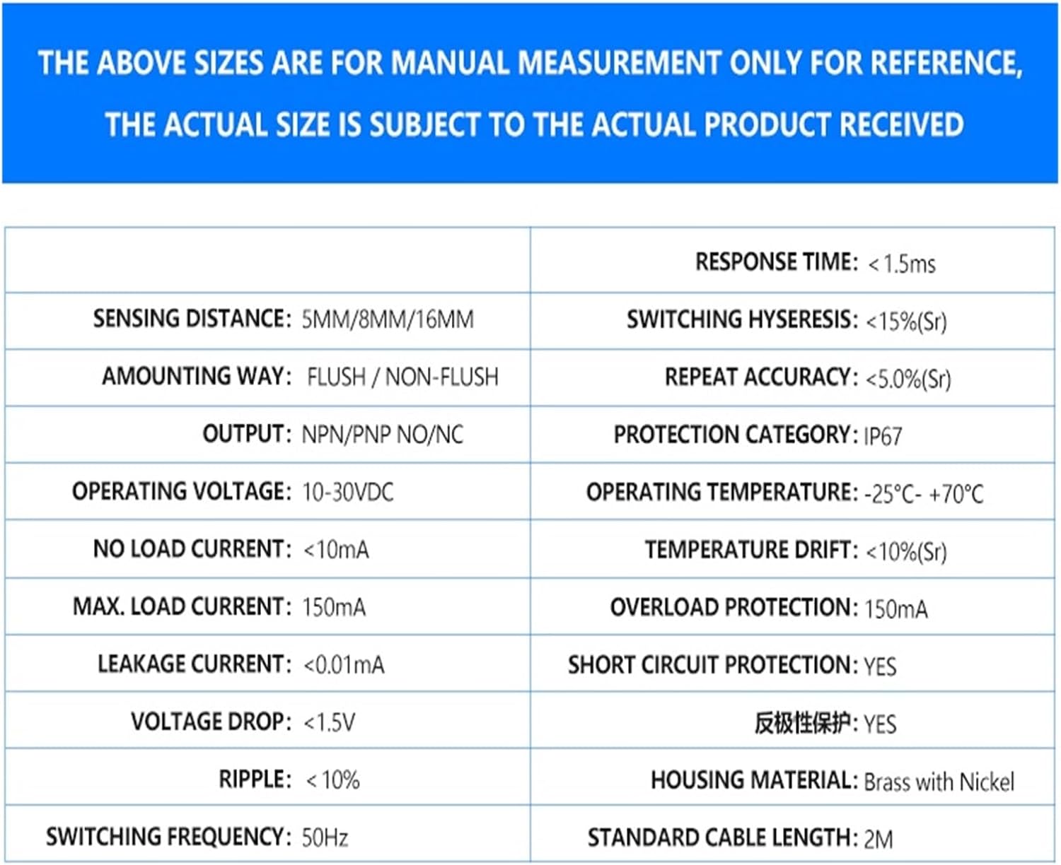 Proximity SensorsDescription: Capacitive sensorModel: JM-metal-M18Type: Capacitive proximity sensorOrigin: Guangdong, ChinaApplication: Detection of all conductive objectsTheory: Capacitive Proximity SensorsOutput: NPN or PNPProduct Name: M18 Metal Pipe Capacitive SensorSize: M18Sensing distance: 5mm/8mmWorking temperature: -25~75Color: SilverMaterial: Stainless steelMinimum Order Quantity: 50Installation: EmbeddedWorking voltage: 10-30VDC