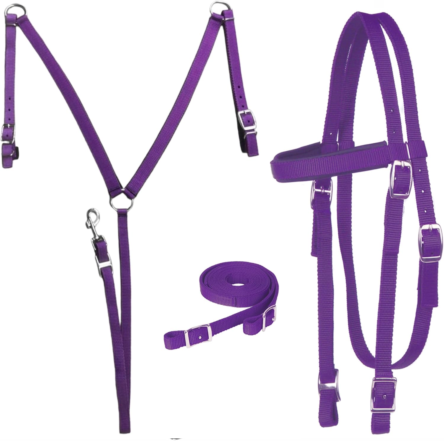 This padded headstall, reins and breastcollar set from Majestic Ally is built to last. Constructed from highly durable 2-ply nylon with nickel-plated hardware, it provides comfortable yet secure control. The adjustable headstall fits comfortably around the poll for a custom fit on most horses. Quick-release Conway buckles allow for easy bit changes without tools. Padded browband and breastcollar cushion contact areas for comfort, while neoprene padding prevents chafing. Durable nylon reins provide steady steering and control. Suitable for full-sized horses, this versatile tack set is designed for long-lasting performance session after session in the ring or on the trail and available in 7 vibrant colors.