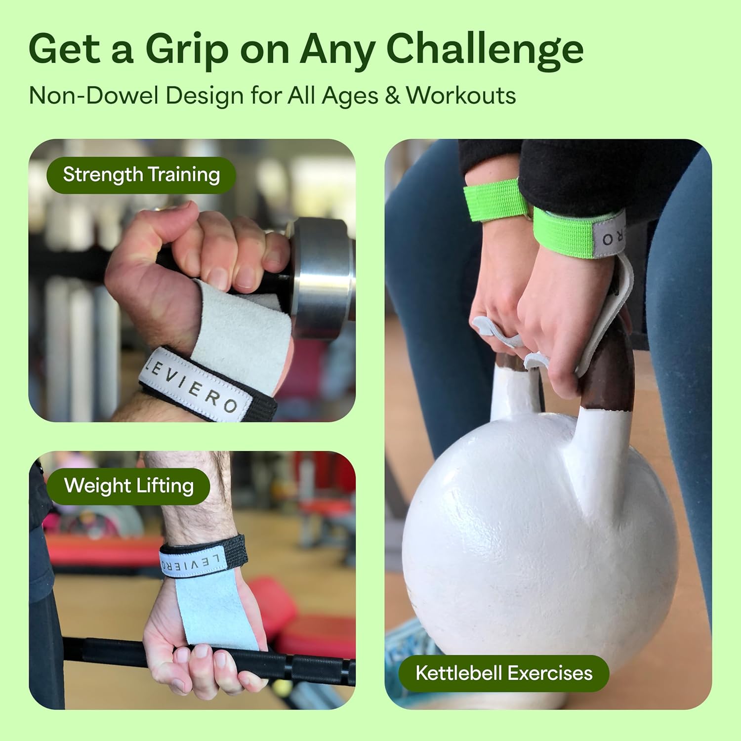 CONSISTENT STRENGTH Gymnastics? Pullups? Lifting? Choose LEVIERO grips! When it comes to strength training using bars, the last thing you want to worry about is your getting rips and tears - you need something comfortable and dependable! Introducing the best looking, most comfortable gymnastics grips you'll ever wear! There's nothing else like these LEVIERO gymnastics grips. These grips have been made for aspiring champions - carefully designed to provide amazing comfort and hand protection. With double leather layers, double stitching, stainless steel D-rings and super soft leather, you’ll never need to look anywhere else for durable, comfortable gymnastics hand grips. These gymnastic grips for girls, boys, kids, youth, men and women, come in vibrant, fun colors that truly stand out - so you can look amazing while competing and training!WHAT’S INCLUDED (1) Pair of Hand Grips with Hook and Loop Straps and Stainless Steel D-rings (1) Pair of Cotton Wristbands (1) Mesh Carry BagPRODUCT SPECIFICATIONS Materials: Leather, Cotton, Nylon, Stainless Steel D-Ring Colors: Pink, Aqua, White, Black Available in 4 SizesDESIGNED FOR COMFORT Never worry about blisters or rips again with our unique gymnastic bar grips for all levels and ages. Adjustable finger holes and easily broken in leather means you’ll always have the perfect fitting gymnastic bar grips. Our hand grips are ideal for both experienced athletes and beginners, and for multiple functional fitness applications. To make sure you have everything you need to train or compete, our grips come with cotton wristbands, and a convenient mesh carry bag. LEVIERO means “leverage” - our catchphrase is Leveraged by Design! We believe in high-quality gymnastic grips you can depend on.