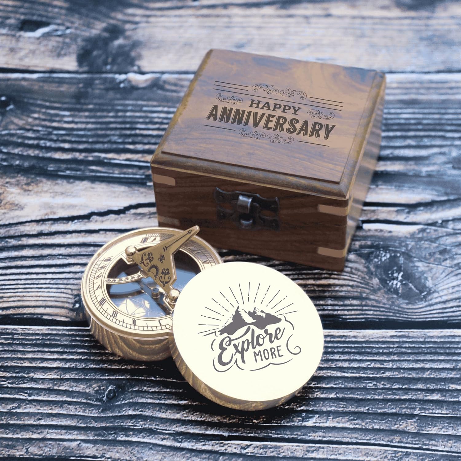 Step back in time with this exquisite brass sundial compass, a timeless piece that combines both artistry and functionality. This elegant navigational instrument features intricate engravings, including a detailed time equation table and precise markings that allow for solar time readings. Housed in a beautiful wooden box with dovetail joints and a luxurious green velvet interior, this compass makes for a meaningful keepsake. The brass construction gives it a classic, vintage appeal while maintaining durability. Perfect as a distinctive gift for special occasions like anniversaries, first communions, or baptisms, this compass can be personally engraved to create a lasting memento. The pocket-sized design makes it convenient to carry, while its decorative appeal makes it equally suitable as a sophisticated desk piece. Each compass comes complete with instructions for use, allowing anyone to master the art of reading this traditional timepiece. Whether given to a son, husband, or cherished friend, this sundial compass represents both a practical instrument and a symbolic guide through life's journey.