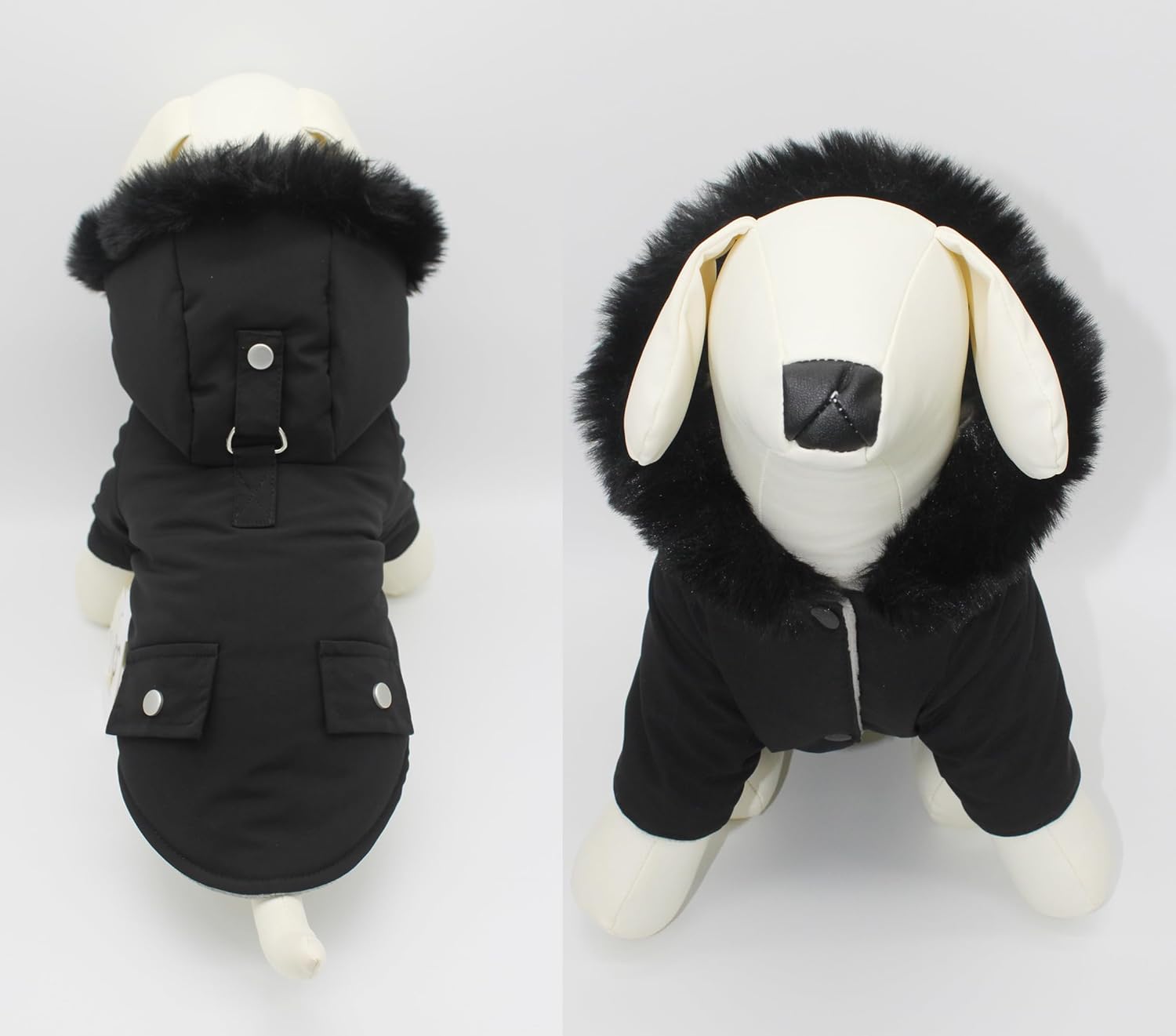 XS for Weight 2.5 - 4 lb, Chest Girth 12 - 14 inches, Neck Girth 8 - 9 inches, Back Length 10 inches, S for Weight 4 - 6.5 lb, Chest Girth 14 - 17 inches, Neck Girth 9 - 11 inches, Back Length 11 inches, M for Weight 6.5 - 10 lb, Chest Girth 16 - 18.5 inches, Neck Girth 10.5 - 12 inches, Back Length 12.5 inches, L for Weight 10 - 14 lb, Chest Girth 18.5 - 21 inches, Neck Girth 11.5 - 13 inches, Back Length 14 inches, XL for Weight 14 - 18.5 lb, Chest Girth 20 - 23 inches, Neck Girth 13 - 15 inches, Back Length 15.5 inches, XXL for Weight 18.5 - 23 lb, Chest Girth 23 - 26 inches, Neck Girth 15 - 17 inches, Back Length 17 inches. Shell: 100% Polyester, Lining: 100% Polyester, Faux Fur Trim: 100% Acrylic, Filling: 100% Polyester Machine Washable, please do not tumble dry, line dry in shade, cool iron, do not bleach. Please refer to our size chart to find the perfect fit for your four-legged companion (Please SIZE UP if measurements fall between sizes). Model measures Neck Girth 11", Chest Girth 15", Back Length 11", and is wearing size S of Alexander Winter Coat. Crafted with the high quality materials, this insulated coat boasts water-resistant features, making it ideal for outdoor adventures even in damp conditions. The faux fur trim adds a touch of elegance, creating a modern and chic look that's sure to turn heads during those frosty walks. The interior is lined with soft fleece, offering a cozy and snug fit to keep your pet toasty and comfortable. Whether it's a playful romp in the snow or a leisurely stroll, this jacket is tailored to keep your pet warm without compromising on style. A blank white label at seam for putting down your dog's name and contact info.