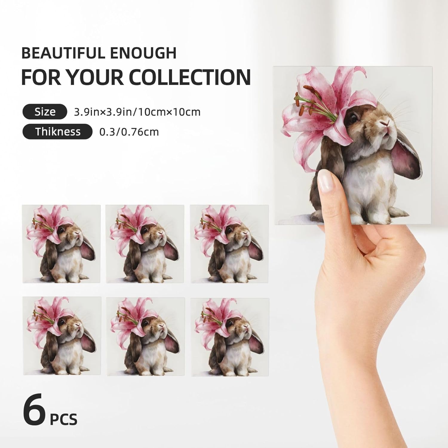 Product Name: DCEHGEW Ceramic Drink CoastersMaterial Type: Ceramic with cork bottomSize: Round: 4.1 x 4.1 inches, Square: 3.9 x 3.9 inches, Hexagon: 4.3 x 3.7 inchesPattern: rabbit About Our Ceramic Absorbent Coasters:Product Features - Crafted from high-quality ceramic, these coasters are odorless and eco-friendly. Their superior absorbency keeps your surfaces dry by quickly soaking up spills from coffee, cola, and other beverages within 10-15 seconds.Applicable Scenarios - Perfect for adding a stylish touch to your kitchen, living room, bar, hotel, or restaurant. These coasters are an ideal present for birthdays, Mother's Day, Father's Day, Valentine's Day, anniversaries, housewarming celebrations, or Christmas.Accessory Structure - Each set includes 6 ceramic coasters with cork bottoms, accompanied by a sleek black metal stand for organized and aesthetic storage. Choose from three different shapes to suit your style and needs.Washing Instructions - Easily clean these coasters with water or a damp cloth.Special NoteDue to different measurement methods, a deviation of up to 0.3 cm in size is considered normal.Please Note:The product images are for reference only. Actual products may vary slightly due to production factors such as batch differences and machine settings. Minor variations in color, position, and size are normal and not considered defects. Thank you for your understanding!Customer Service:We want to make sure you have an amazing experience with us. Please contact us with any feedback you may have. We love to hear from you and usually respond within 12-24 hours.