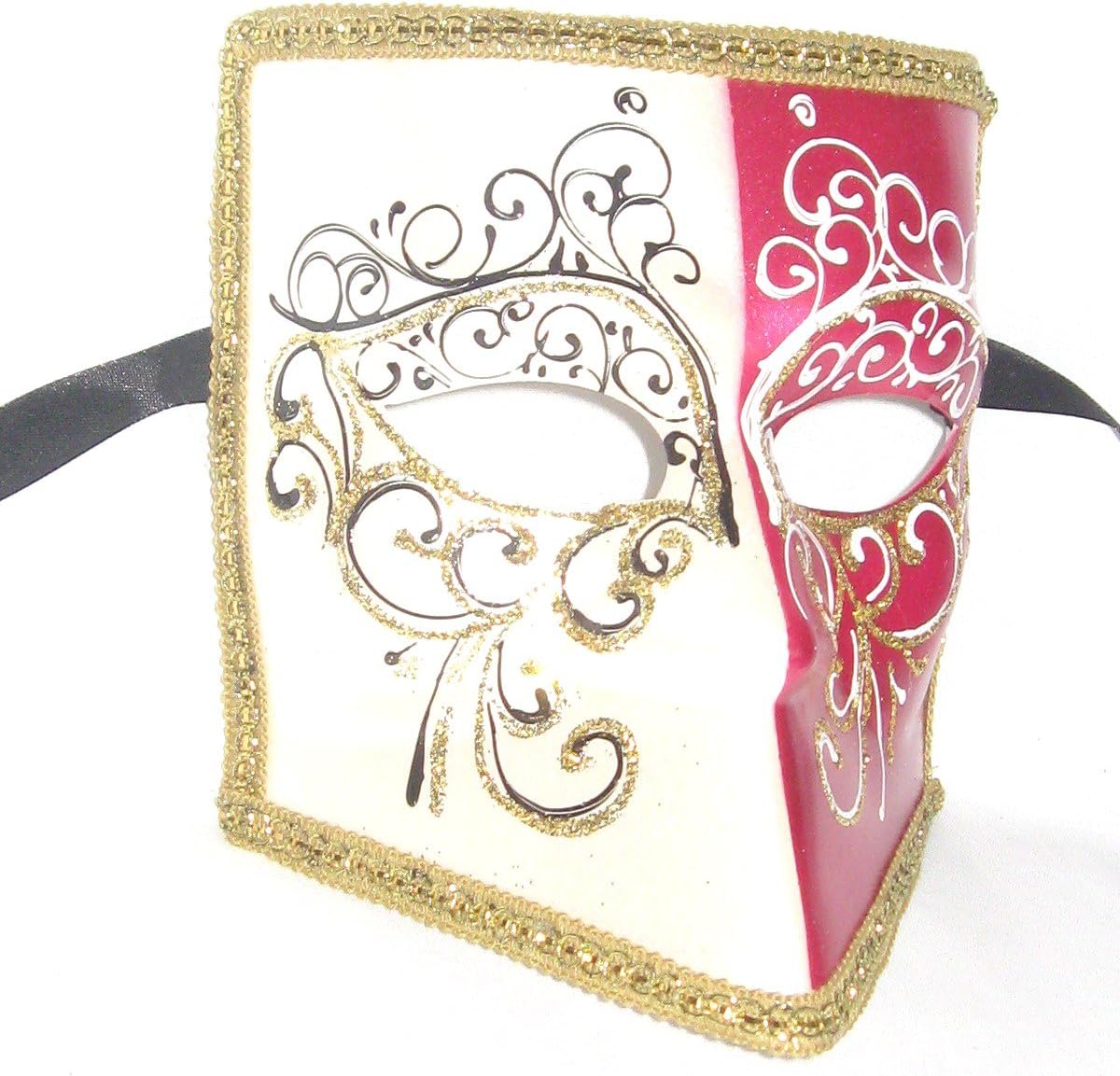 Hand made and hand decorated venetian "Bauta New Lillo" mask from Venice, Italy. Casanova or knight mask is half white and half red. On the white side there is black paint accents with gold glitter accents and on the red side there is white paint with gold glitter accents. Mask comes with black satin ties, is light enough to wear all night. Mask size: 7 1/2 inches high by 6 inches wide. As with all of our masks, this mask comes with a tag guaranteeing authenticity from the artist in Venice, Italy. Display as art after wearing.
