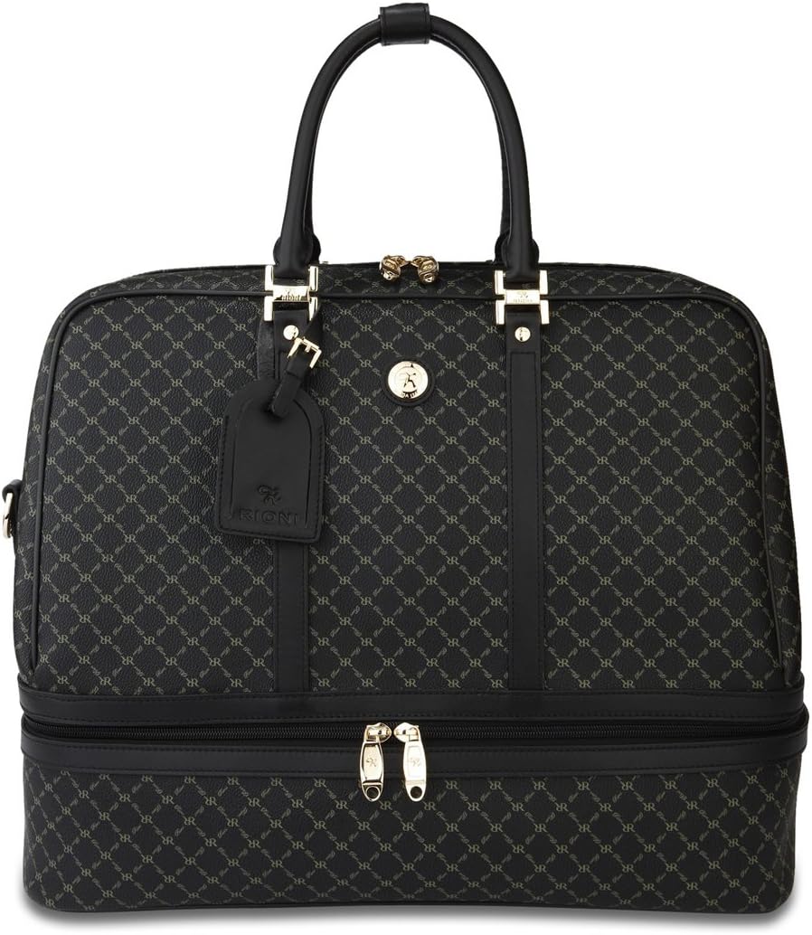 STB-20051 Features: -Travel duffel.-Fabric lining.-Leather ID tag cover.-Zipper opening entrance.-Bottom zipper compartment.-Interior has two pocket pouches and a zipper pocket.-Detachable shoulder sling.-14" H x 10" W x 18" D, 5 lbs. Color/Finish: -Color: Black.-Designer canvas body accented with dual-looped leather handle and trim. Collection: -Signature collection.