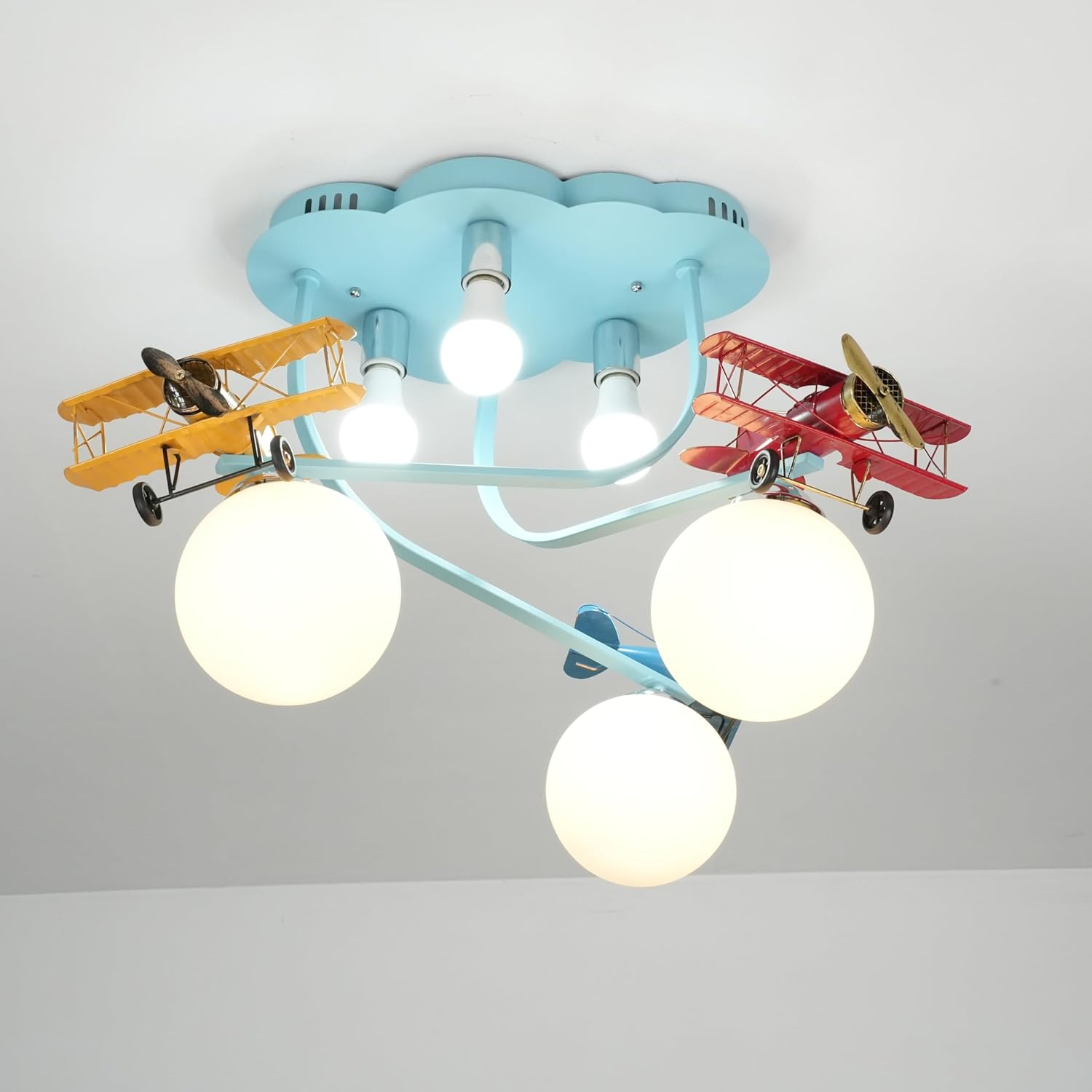 Specifications: Actual Size: 19.6"Hx33"Wx33"D Switch Type: Wall Switch Control Bulb Included: Yes Color: Blue Number of Lights: 6 Bulb Base: E26 Indoor or Outdoor: Indoor Material: Metal, Glass Max Wattage: 40W