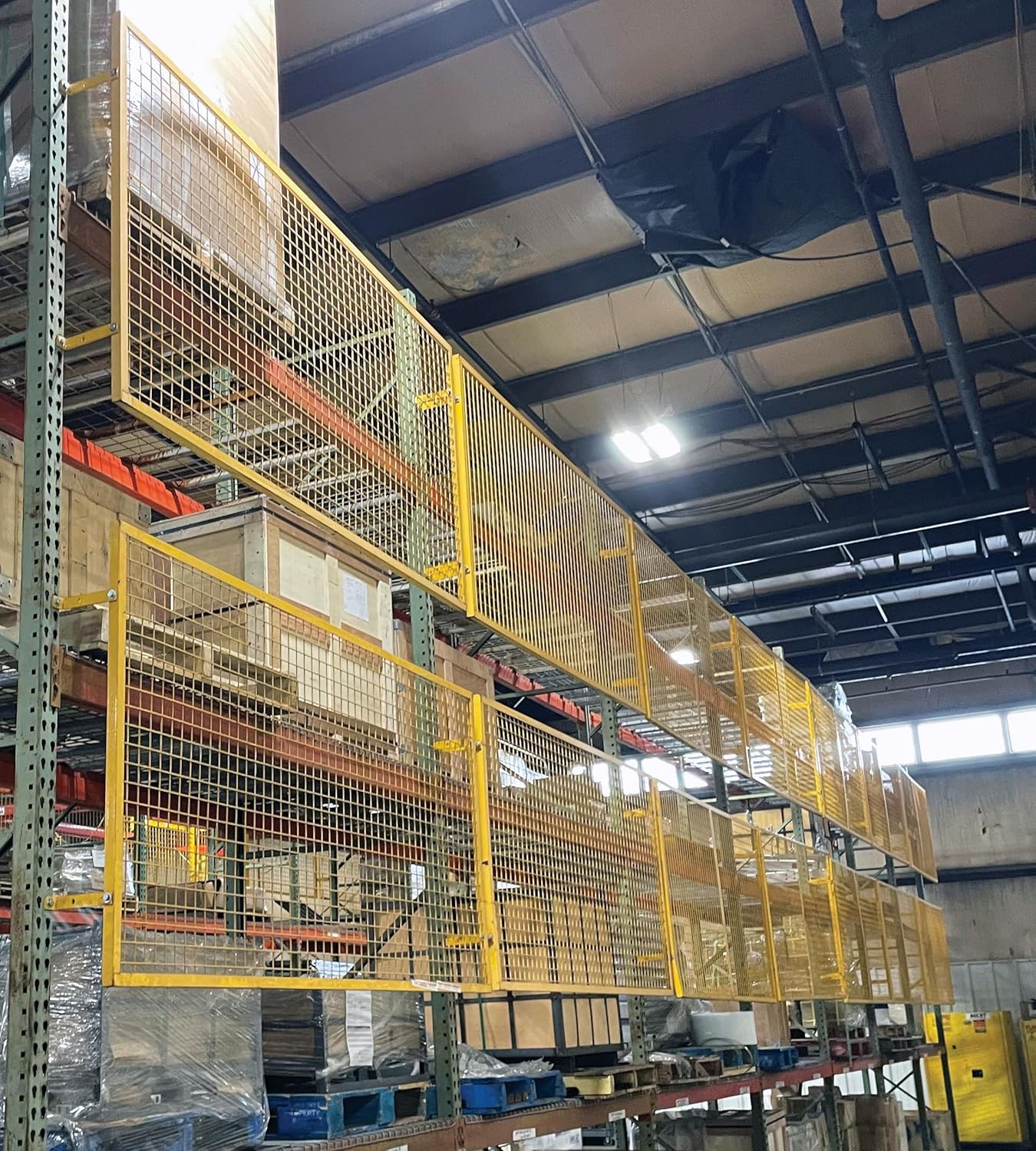 Pallet rack back guard will minimize the potential hazard of product falling out the back of pallet rack. Attach this steel protective shield with the included steel brackets. Spacer bracket installs to space out guard. Wire mesh is attached to angle frame. Hardware included.