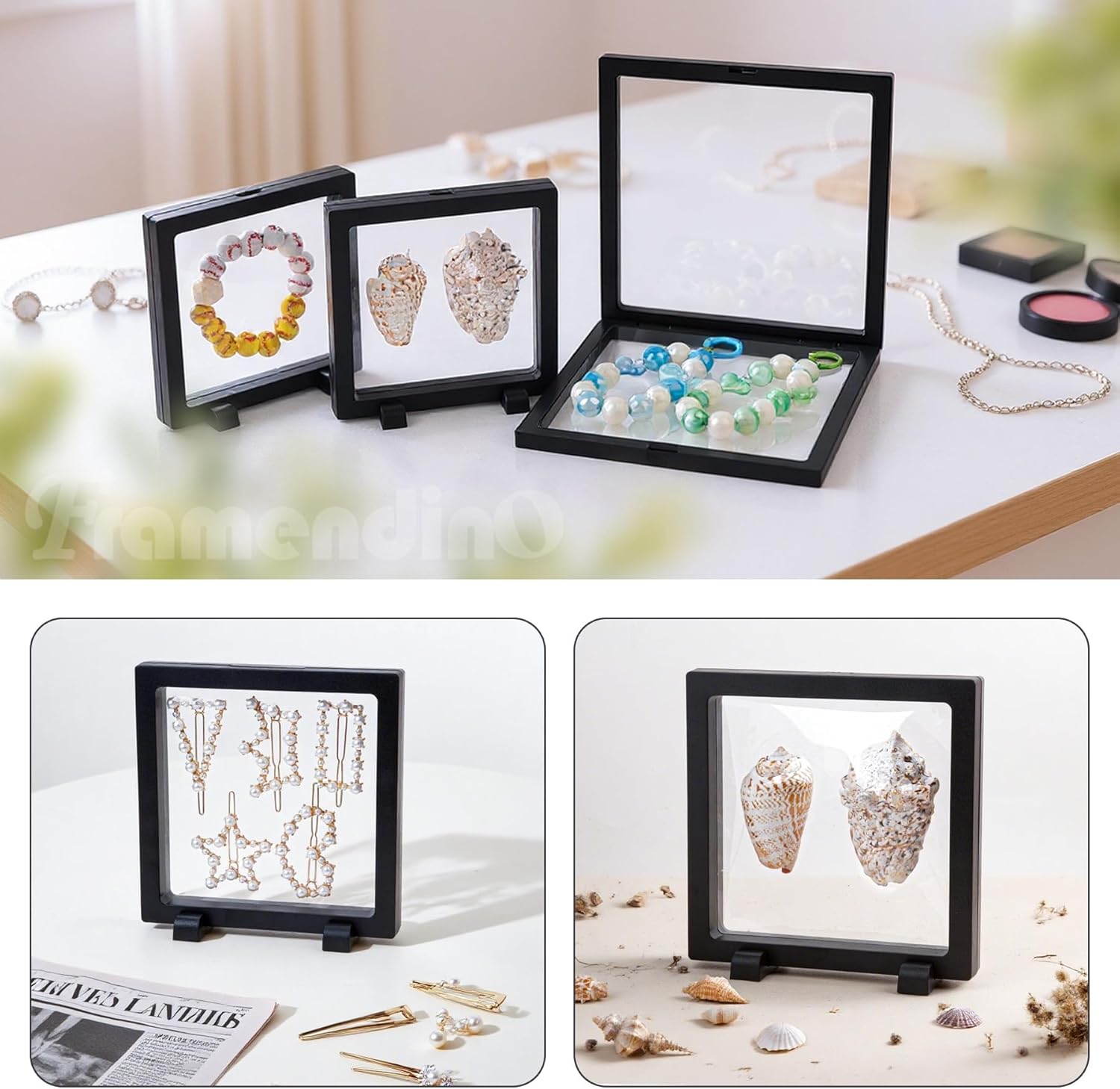 SpecificationMaterial: The coin display case is made of solid ABS plastic and transparent flexible PE film, With double-sided 3D floating effectColor: BlackSize: The 3d floating frame display holder is about 5.5 x 5.5 x 0.8 inch, 7 x 7 x 0.8 inchQuantity: 8 pack, 2 sizes, 4 for each sizeNotePlease allow 1-2mm error in the manually measured size