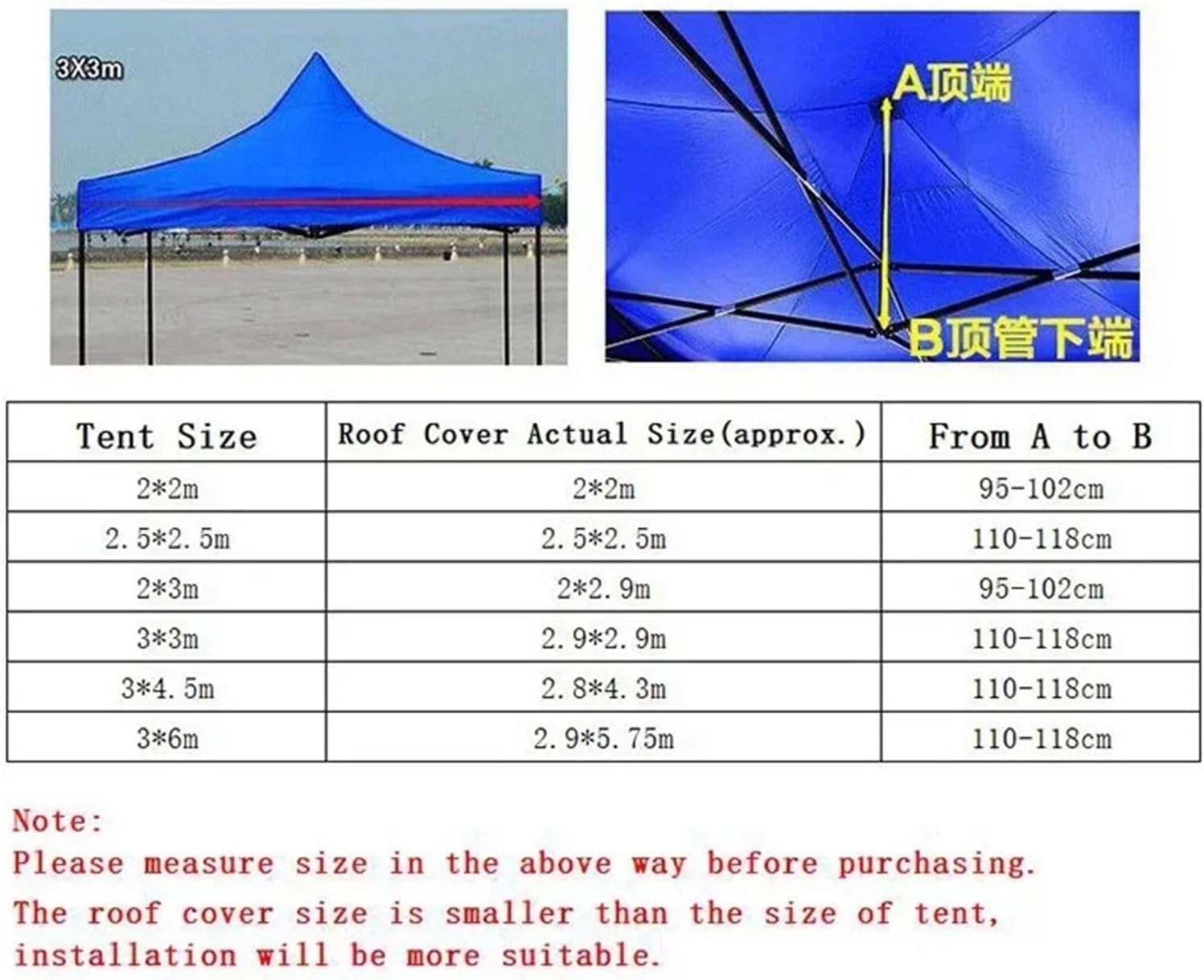Material: oxford clothSize(approx.): 2*2m/2.5*2.5m/2*3m/3*3m/3*4.5m/Package Include:1 x roof cloth(not include frame)Size Guide:The 2*2 m model actually size about 2*2m, suit for 2*2m tentThe 2.5*2.5 m model actually size about 2.5*2.5m, suit for 2.5*2.5m tentThe 2*3 m model actually size about 2*2.9m , suit for 2*3m tentThe 3*3 m model actually size about 2.9*2.9m, suit for 3*3m tentThe 3*4.5 m model actually size about 2.8*4.3m , suit for 3*4.5m tentNotice: Only Include gazebo roof cloth. Not include gazebo frame and wrap wall cloth.Actually manually measured size may have some differences, it is in the range of ± 10cm.Due to different lighting and shooting conditions, the picture color may has a little differences with actual product.